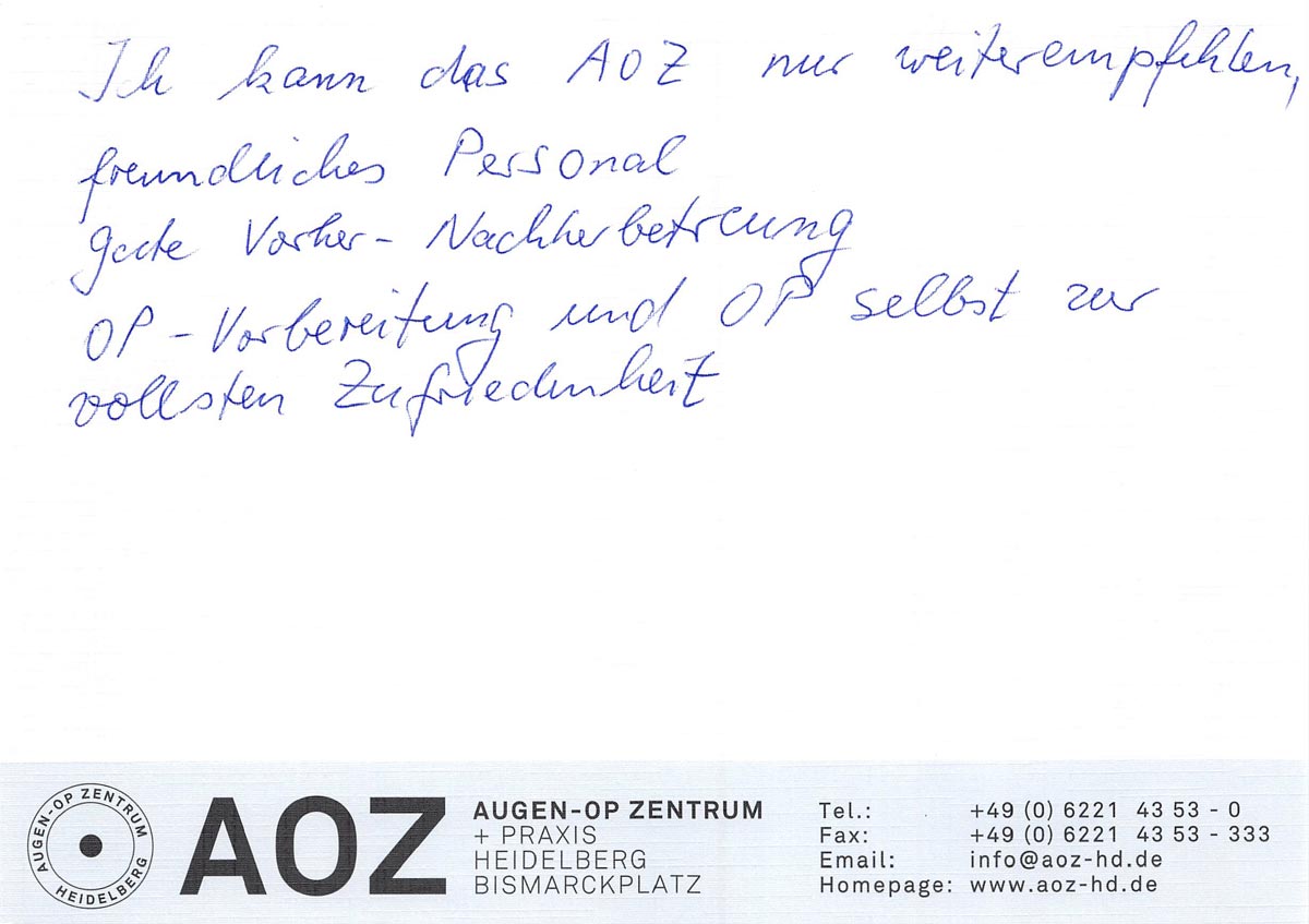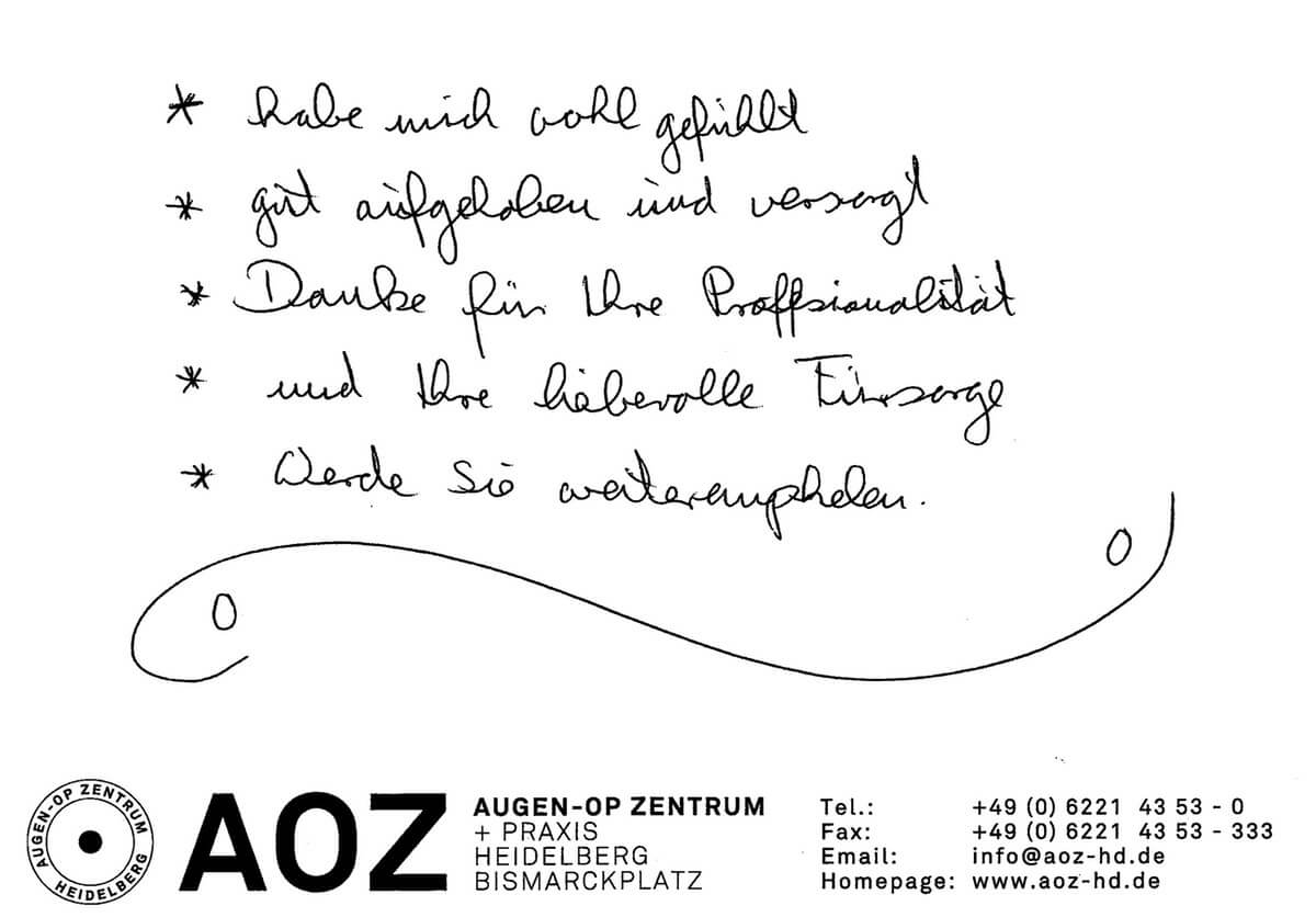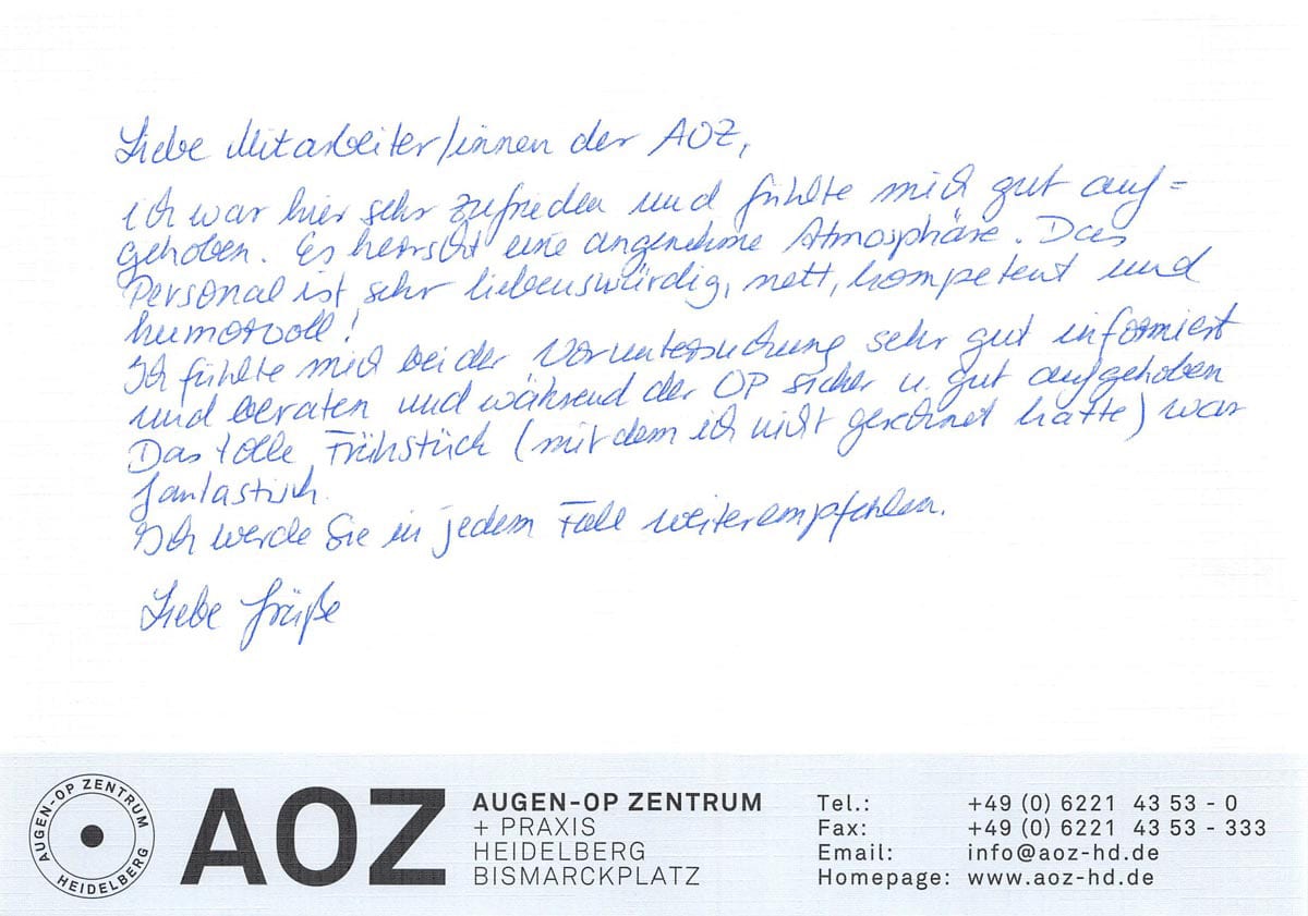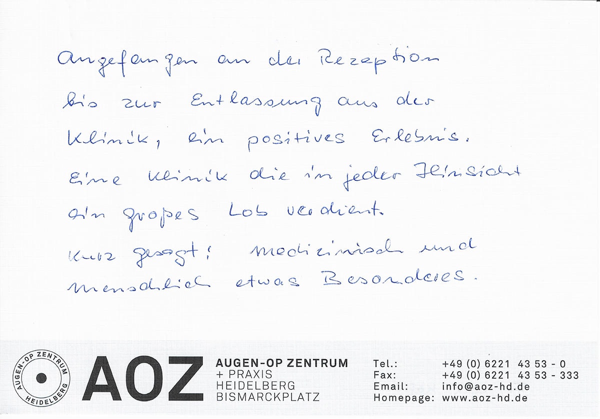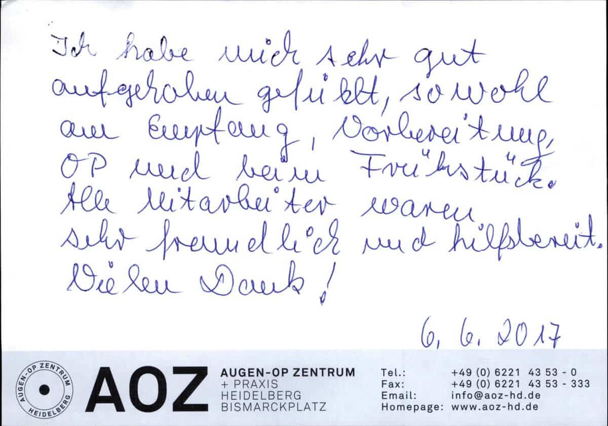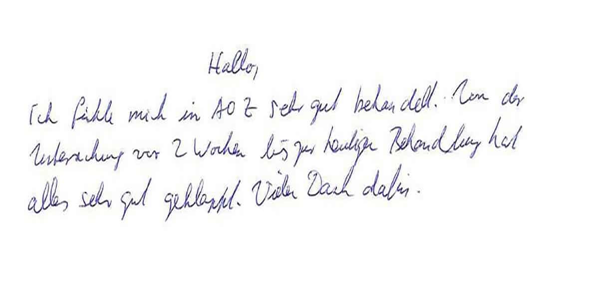Die Erfahrungen unserer Patienten sind uns besonders wichtig. Daher bitten wir sie regelmäßig darum, uns ihre persönliche Meinung und ihre Bewertung aufzuschreiben und diese mit uns und unserem Team zu teilen. Diese Patientenstimmen sind für uns die Chance zur Entwicklung und ein Ansporn uns weiter zu verbessern. Einige unserer Patienten haben wir auch gebeten, uns ihre Erlebnisse im AOZ Heidelberg vor der Kamera zu schildern.