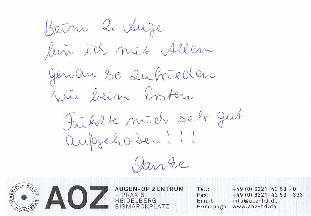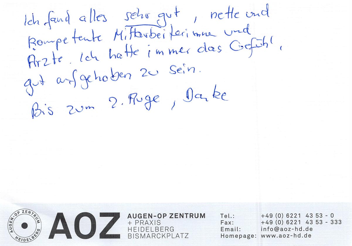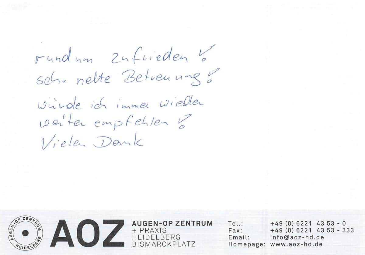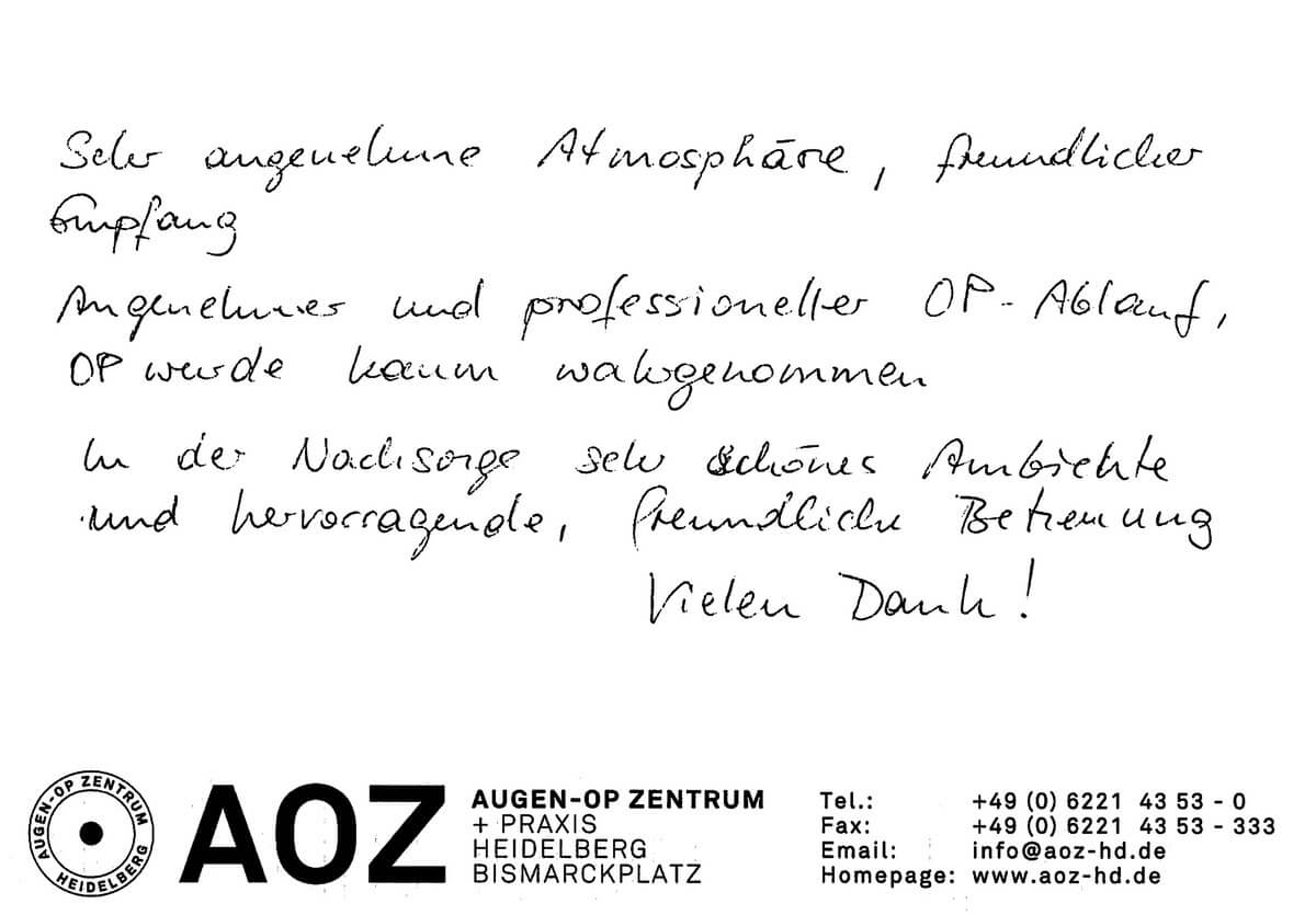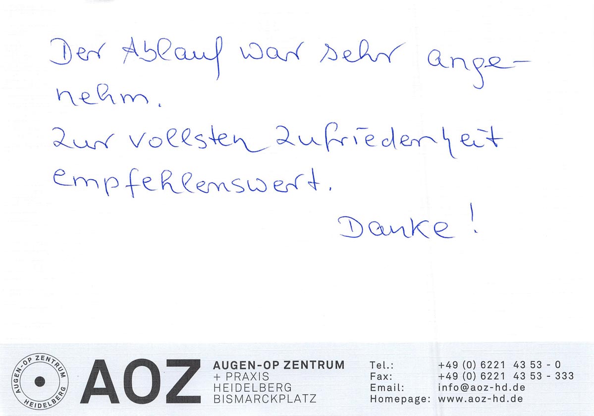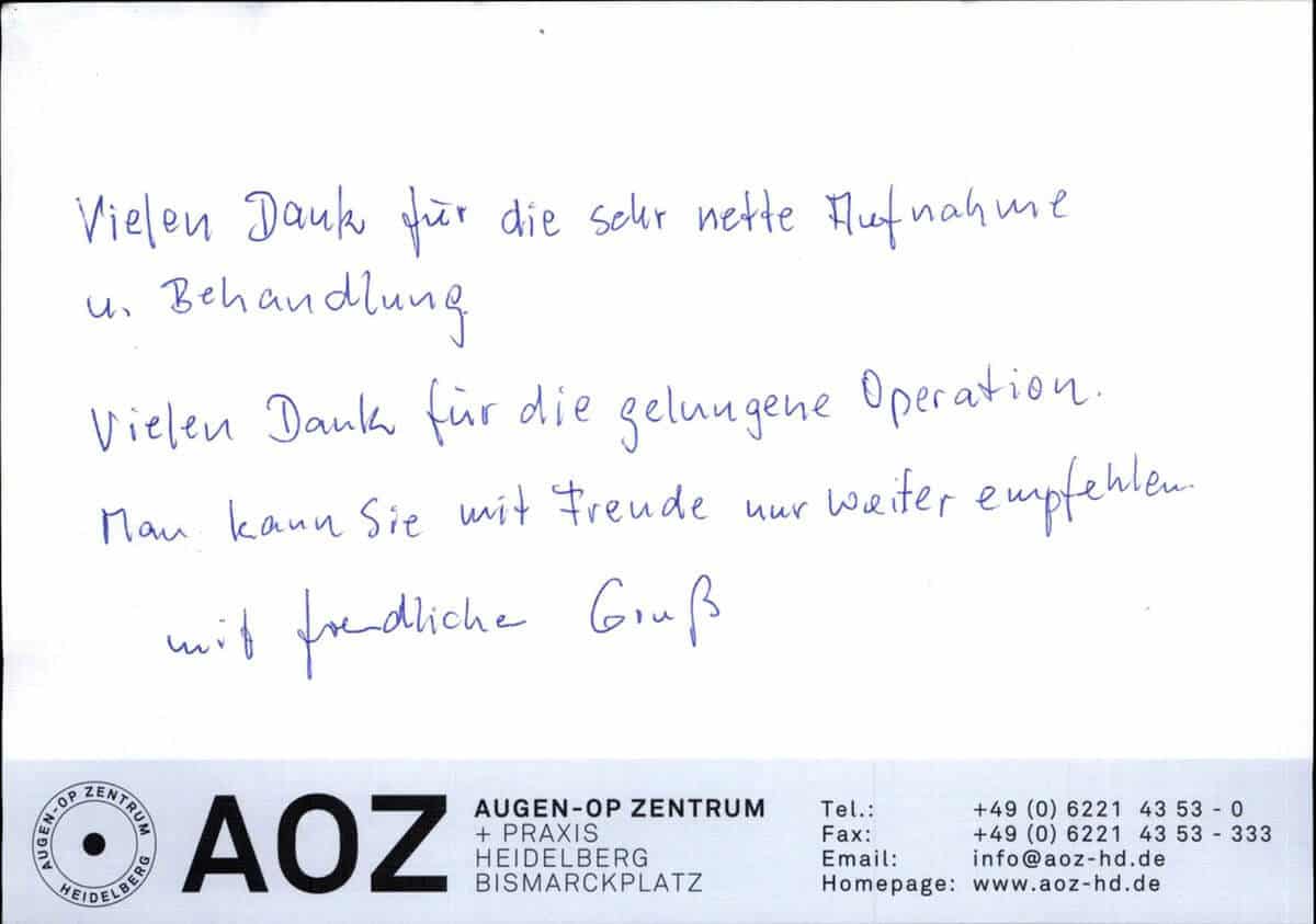 Die Erfahrungen unserer Patienten sind uns besonders wichtig. Daher bitten wir sie regelmäßig darum, uns ihre persönliche Meinung und ihre Bewertung aufzuschreiben und diese mit uns und unserem Team zu teilen. Diese Patientenstimmen sind für uns die Chance zur Entwicklung und ein Ansporn uns weiter zu verbessern. Einige unserer Patienten haben wir auch gebeten, uns ihre Erlebnisse im AOZ Heidelberg vor der Kamera zu schildern.