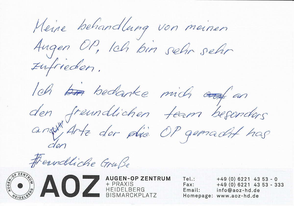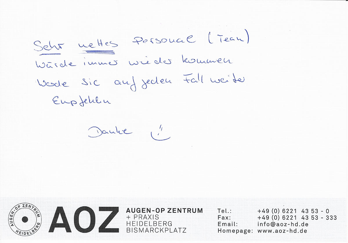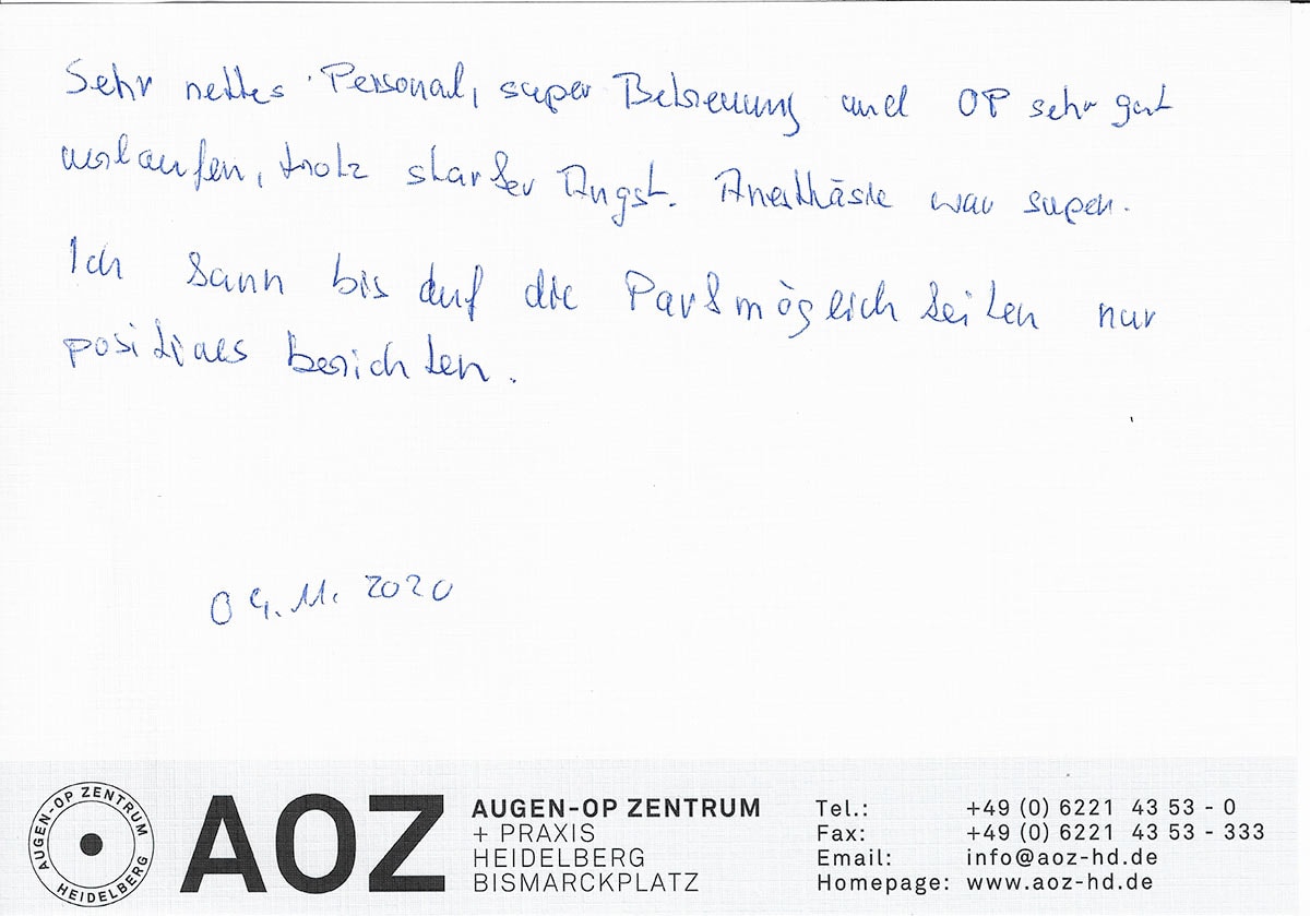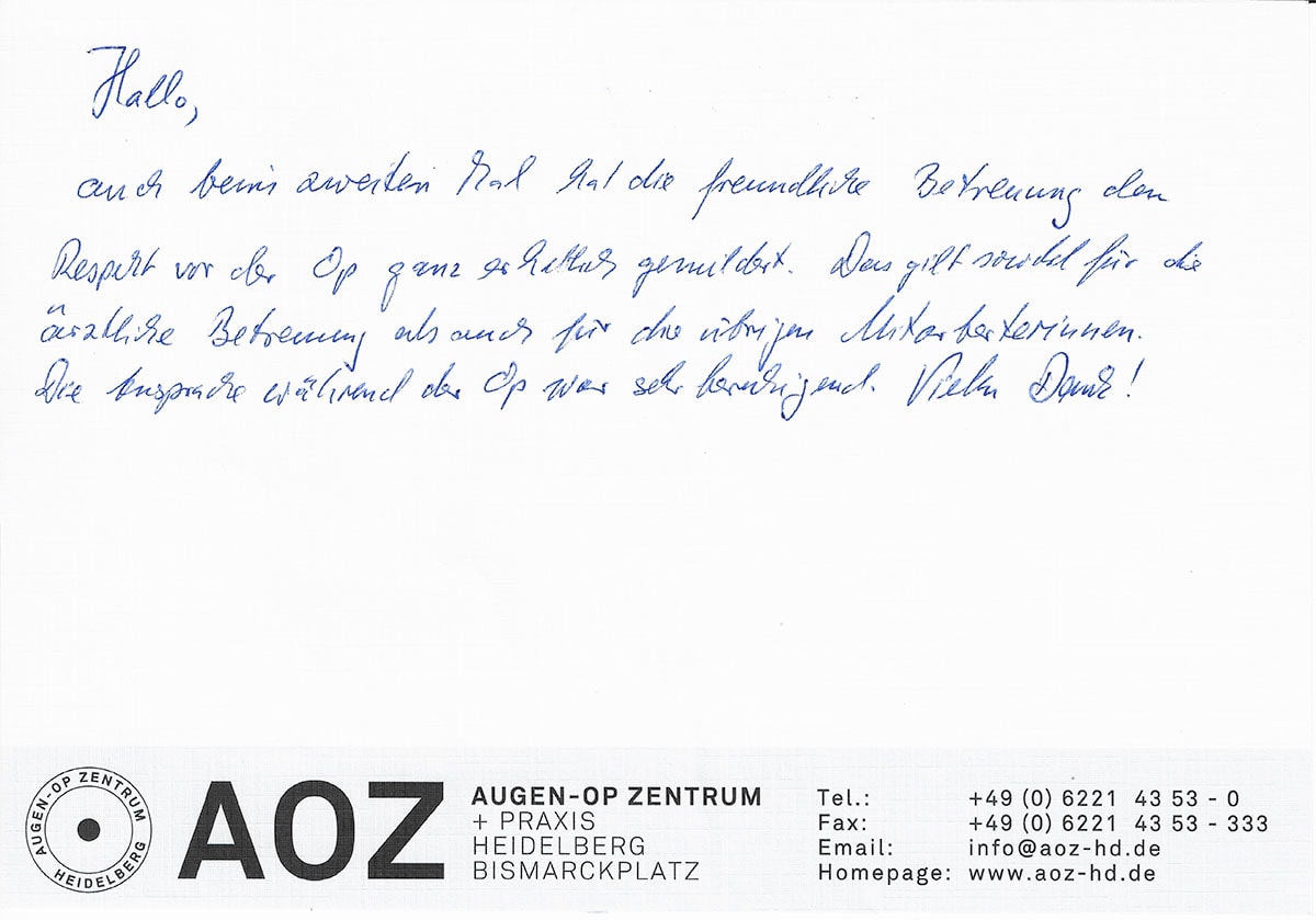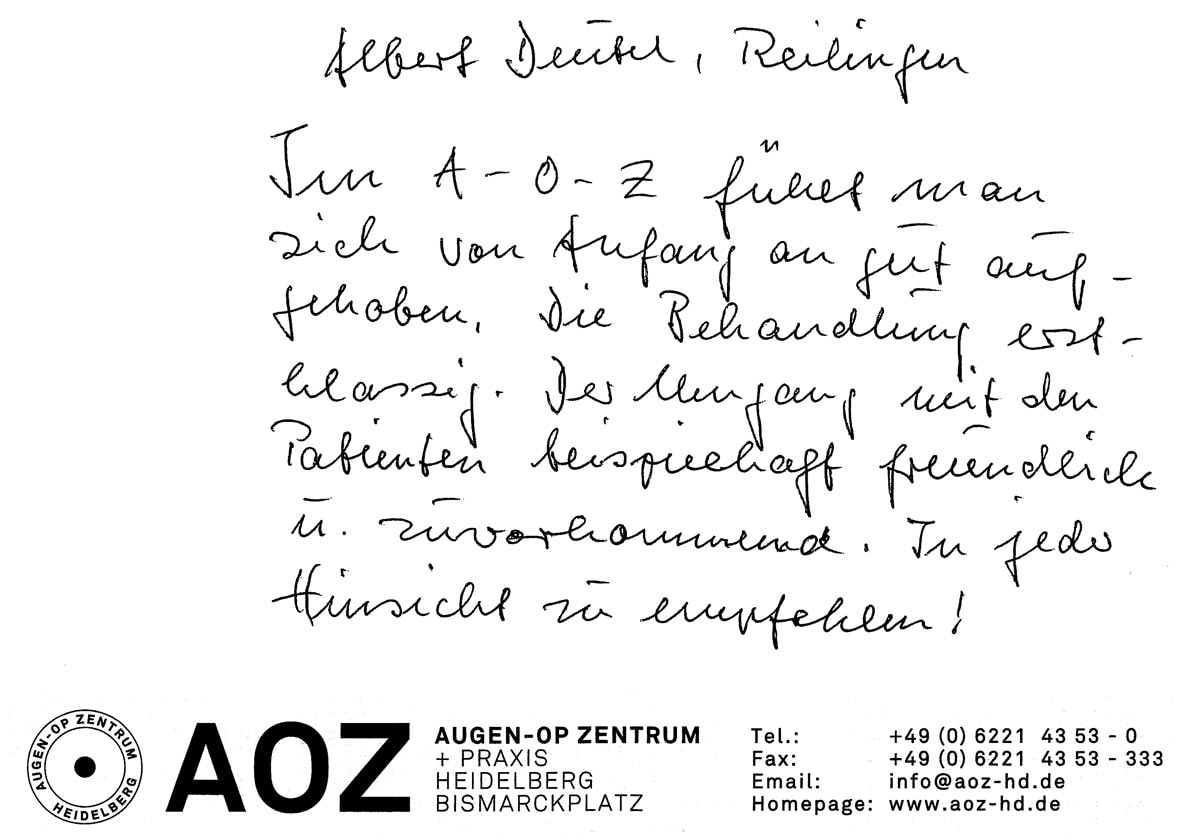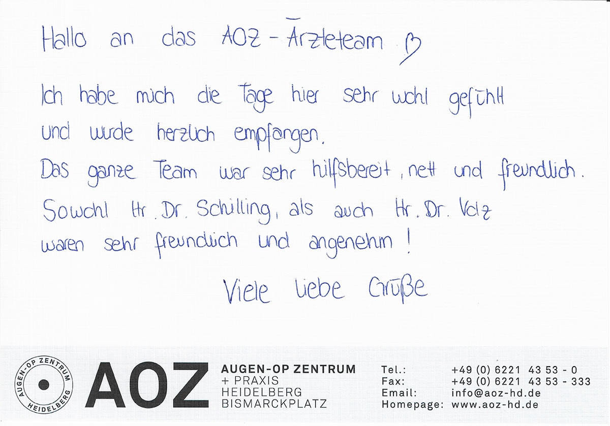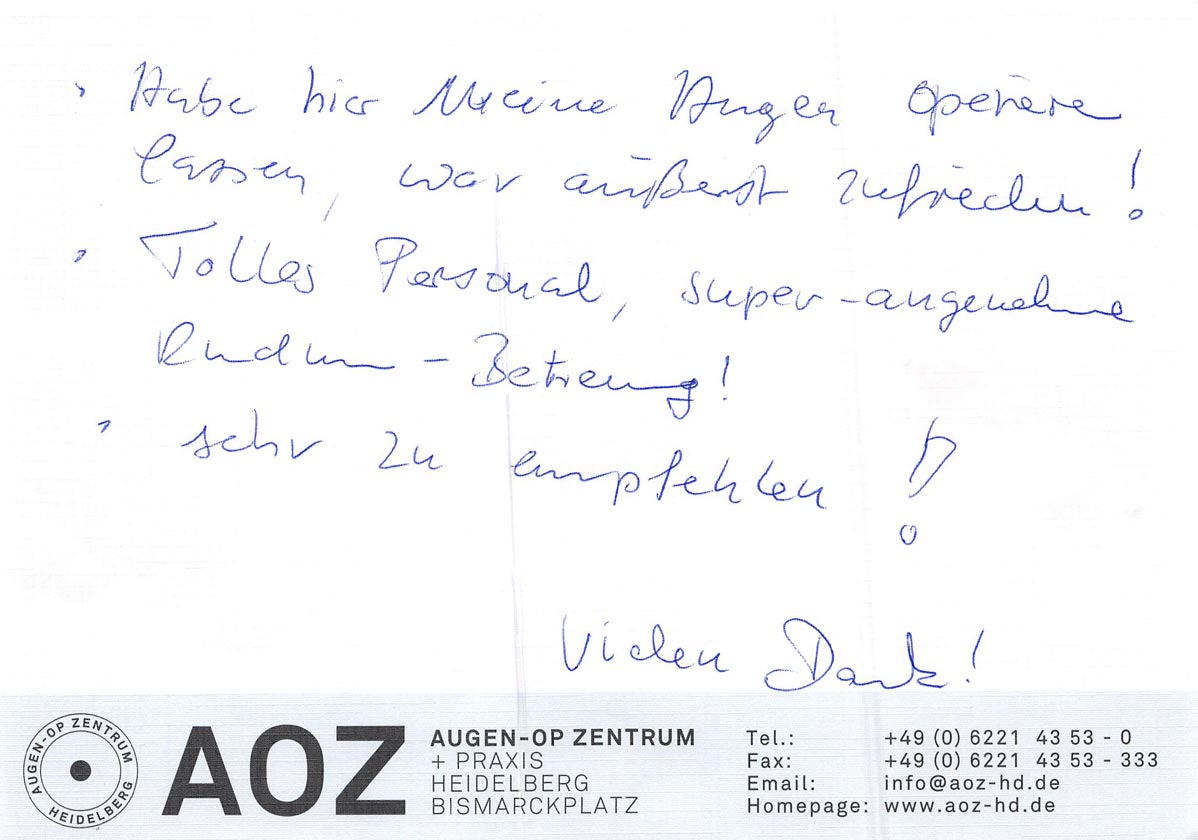 Die Erfahrungen unserer Patienten sind uns besonders wichtig. Daher bitten wir sie regelmäßig darum, uns ihre persönliche Meinung und ihre Bewertung aufzuschreiben und diese mit uns und unserem Team zu teilen. Diese Patientenstimmen sind für uns die Chance zur Entwicklung und ein Ansporn uns weiter zu verbessern. Einige unserer Patienten haben wir auch gebeten, uns ihre Erlebnisse im AOZ Heidelberg vor der Kamera zu schildern.