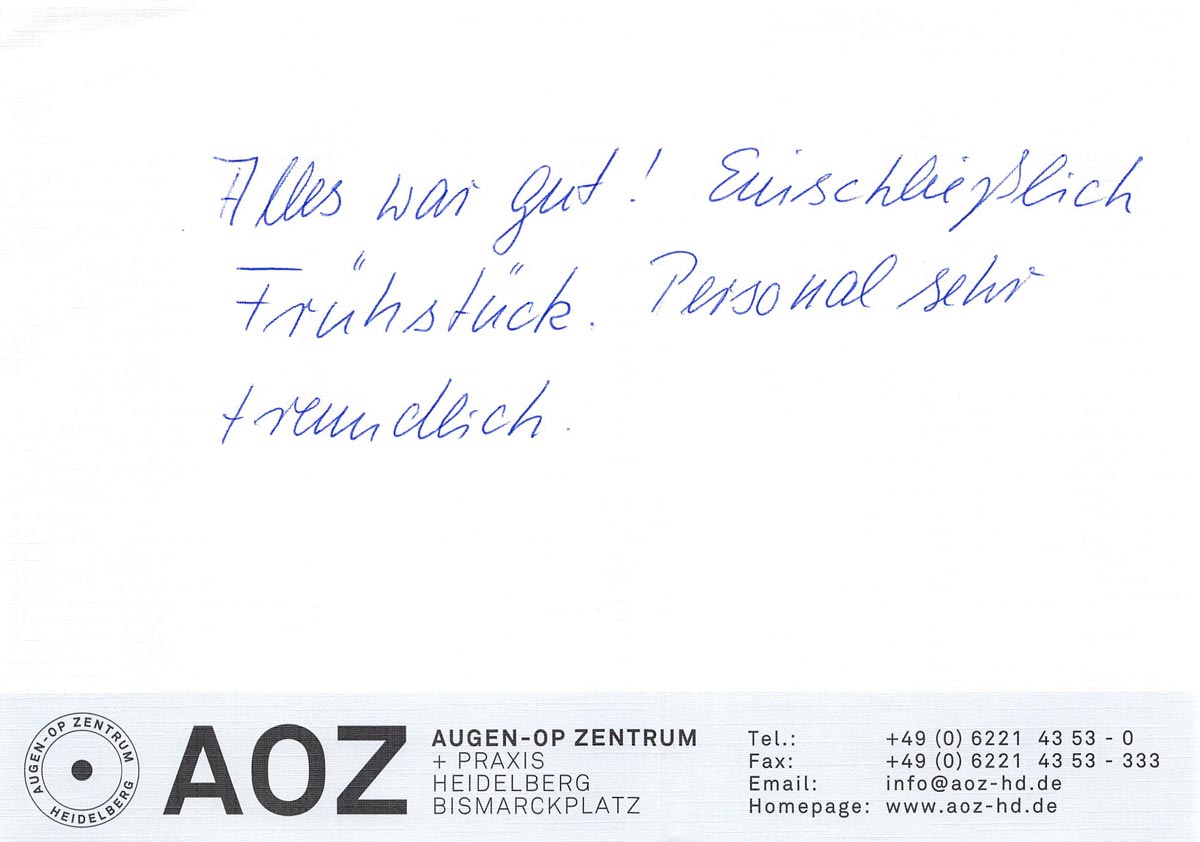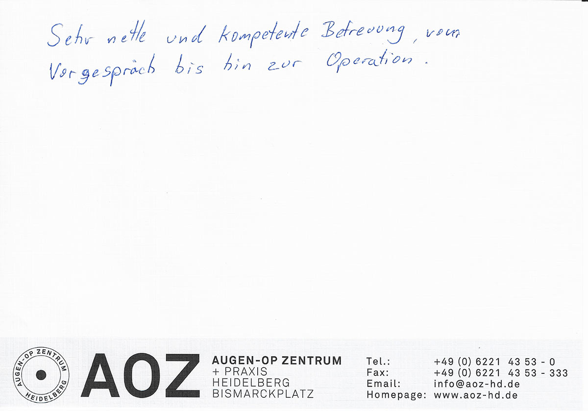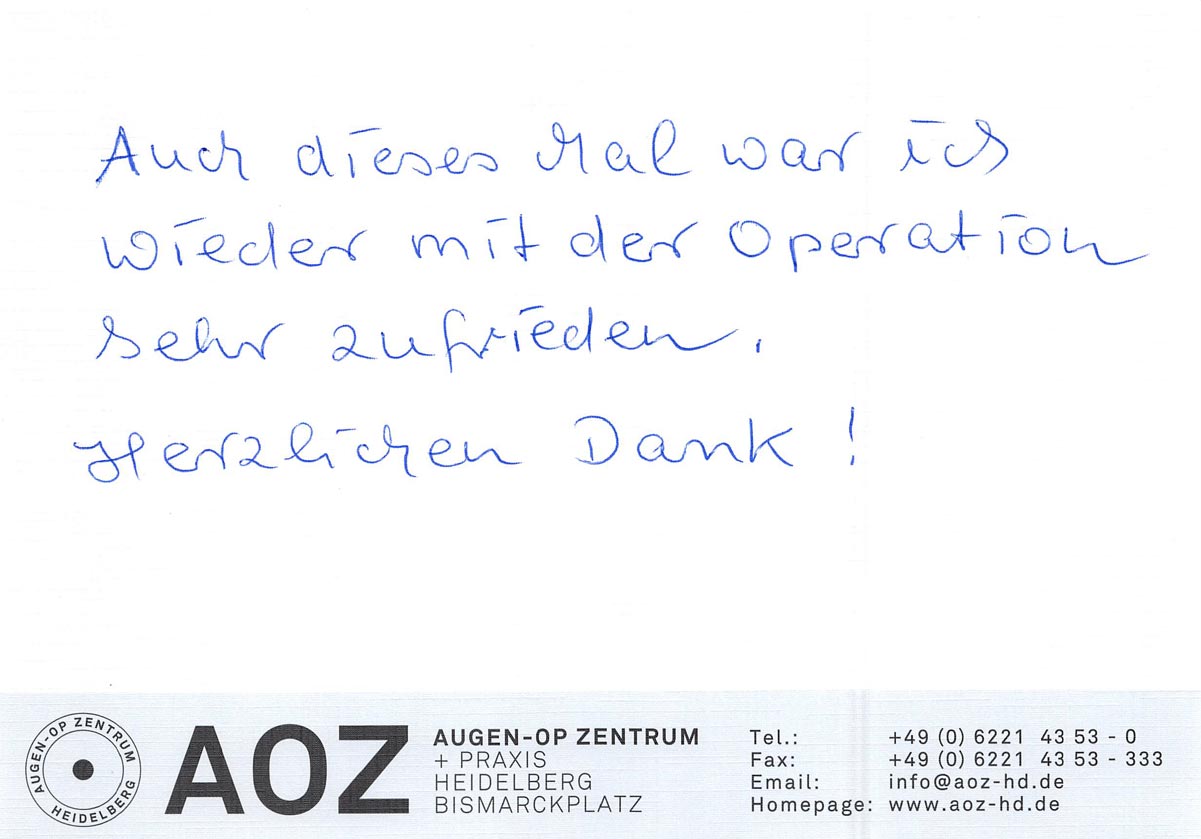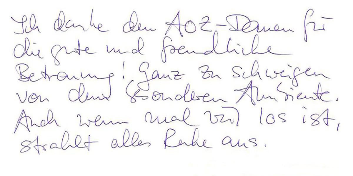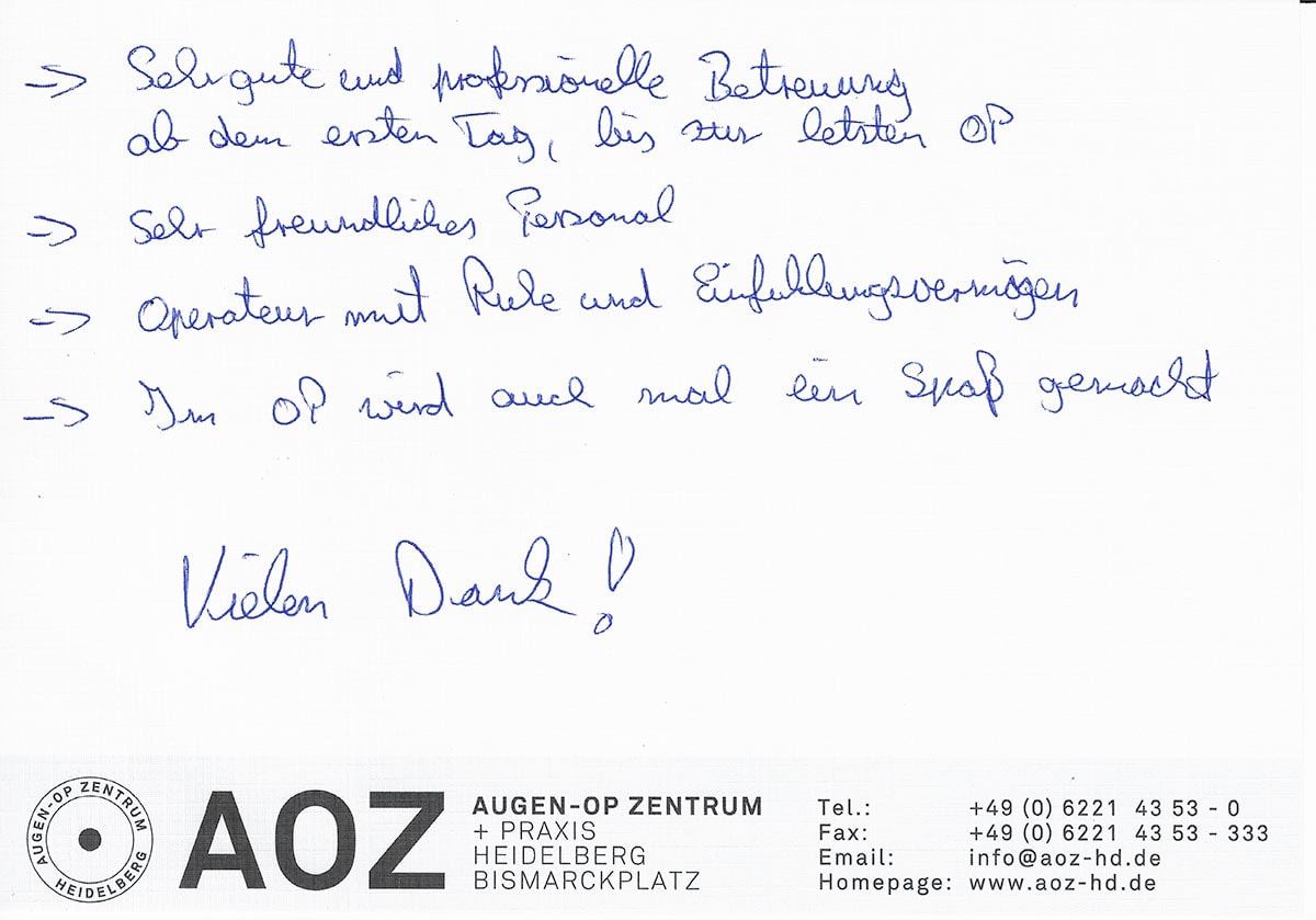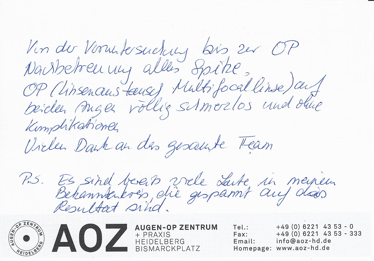 Die Erfahrungen unserer Patienten sind uns besonders wichtig. Daher bitten wir sie regelmäßig darum, uns ihre persönliche Meinung und ihre Bewertung aufzuschreiben und diese mit uns und unserem Team zu teilen. Diese Patientenstimmen sind für uns die Chance zur Entwicklung und ein Ansporn uns weiter zu verbessern. Einige unserer Patienten haben wir auch gebeten, uns ihre Erlebnisse im AOZ Heidelberg vor der Kamera zu schildern.