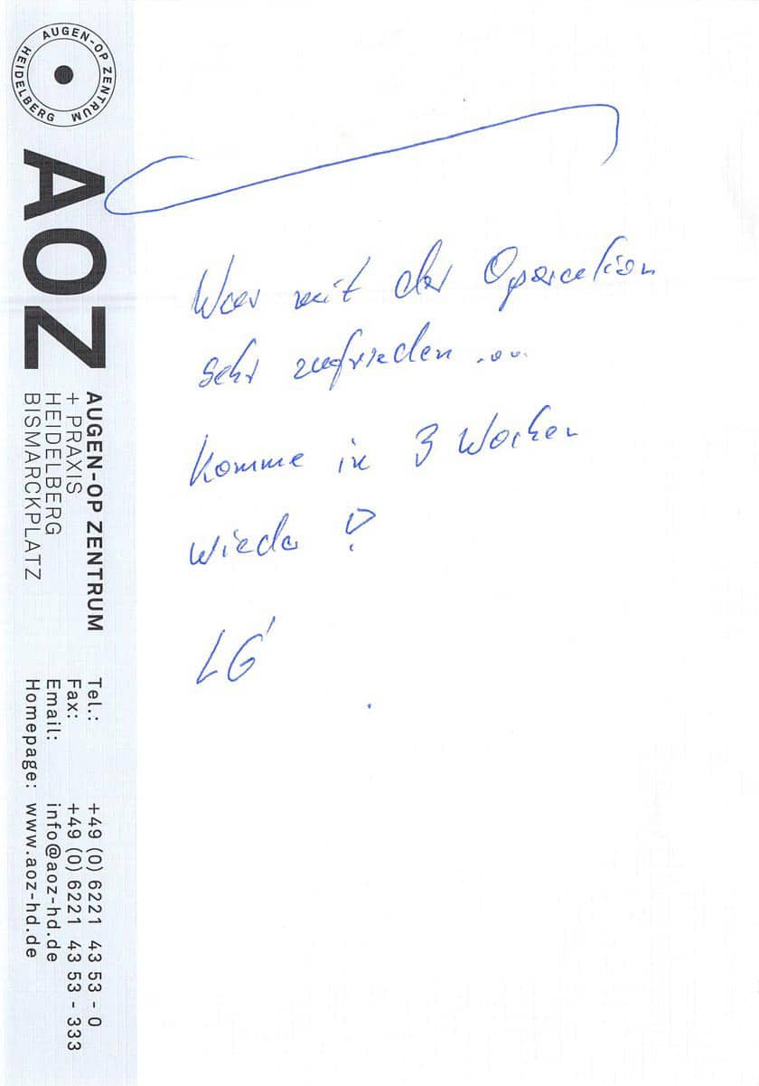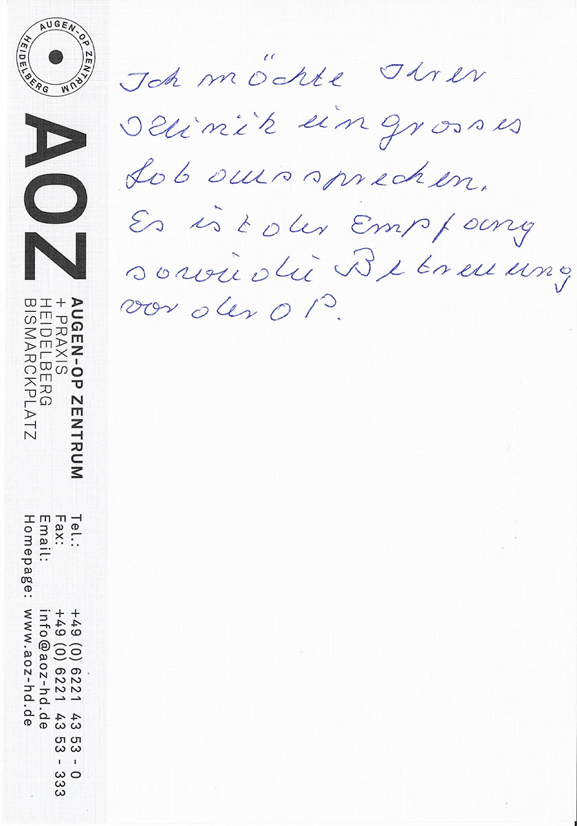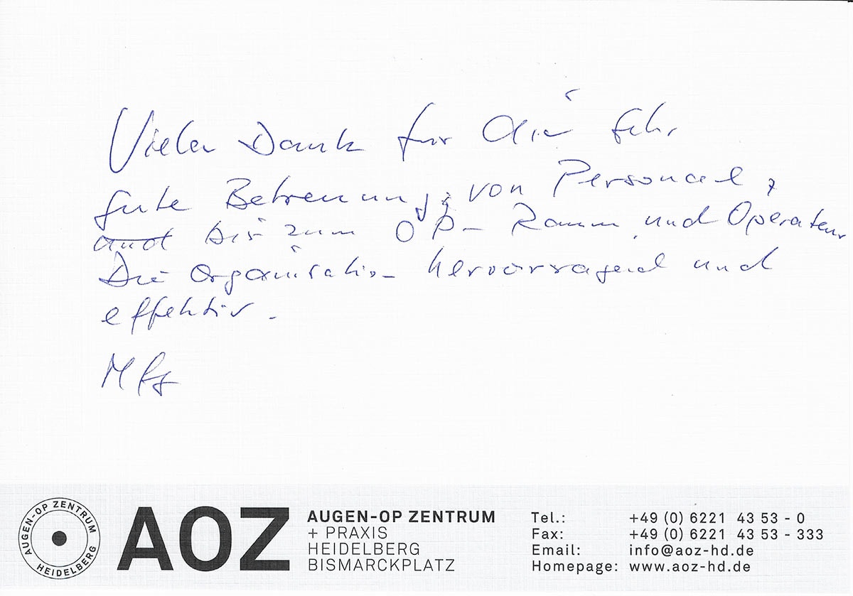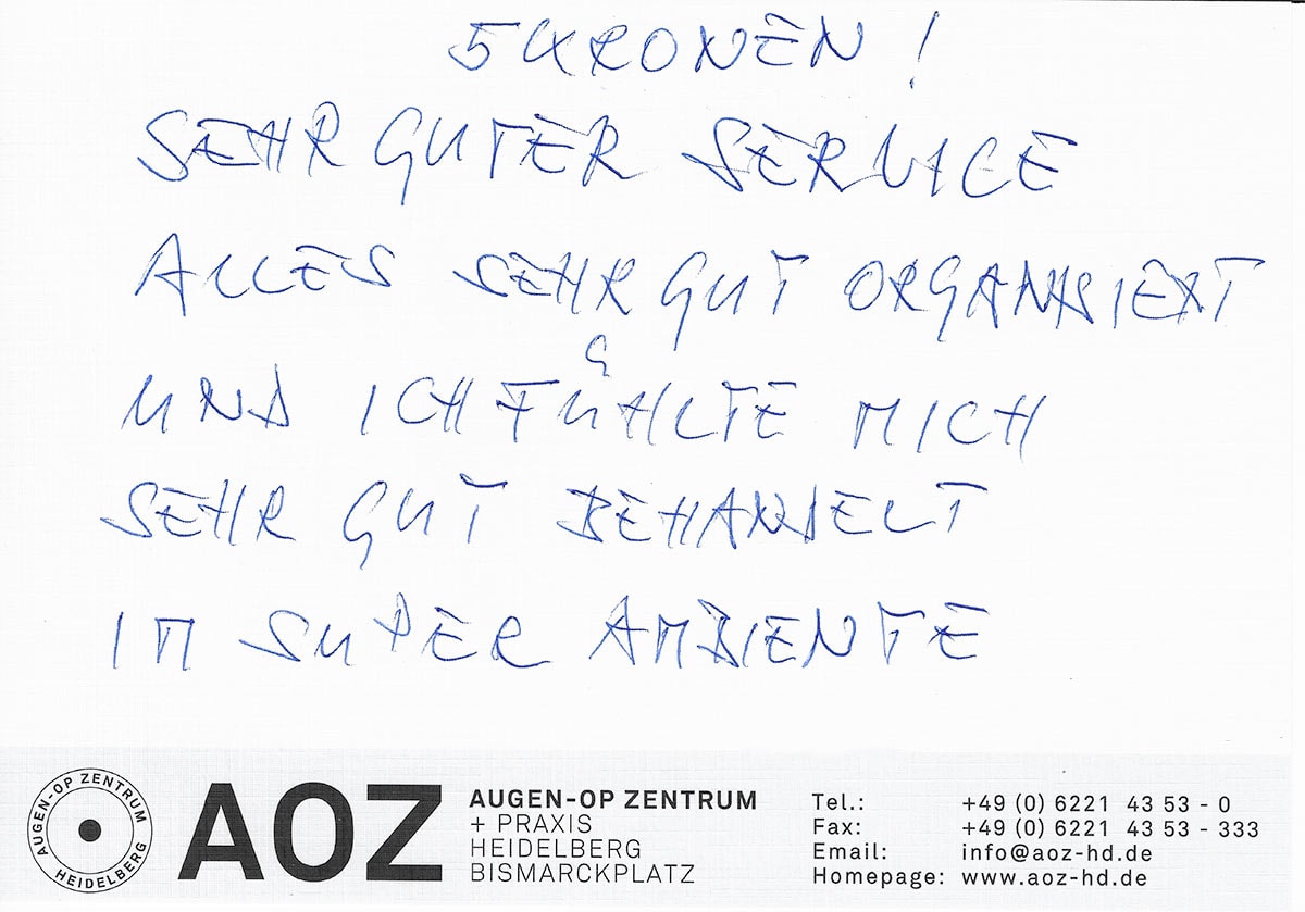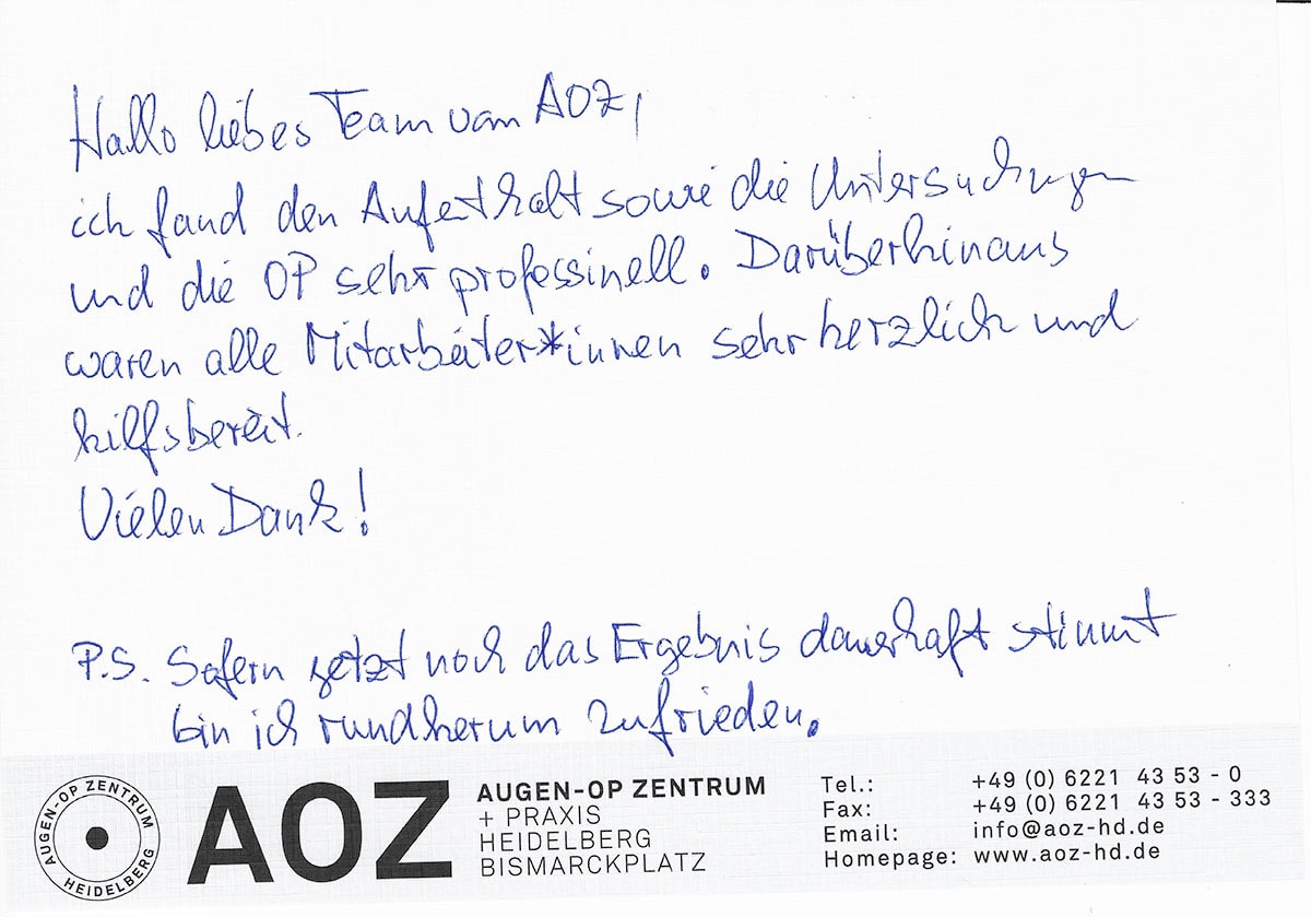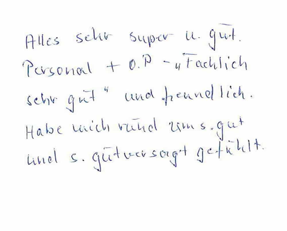 Die Erfahrungen unserer Patienten sind uns besonders wichtig. Daher bitten wir sie regelmäßig darum, uns ihre persönliche Meinung und ihre Bewertung aufzuschreiben und diese mit uns und unserem Team zu teilen. Diese Patientenstimmen sind für uns die Chance zur Entwicklung und ein Ansporn uns weiter zu verbessern. Einige unserer Patienten haben wir auch gebeten, uns ihre Erlebnisse im AOZ Heidelberg vor der Kamera zu schildern.