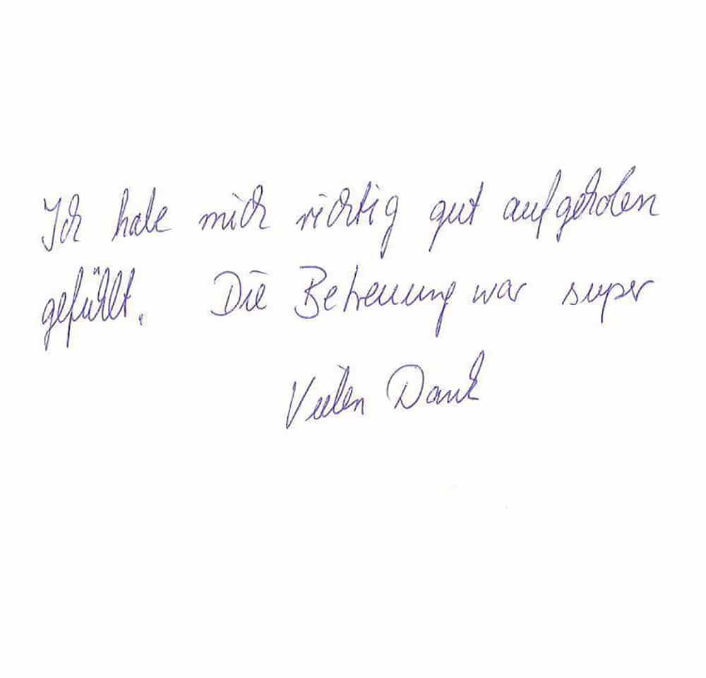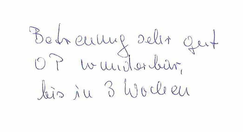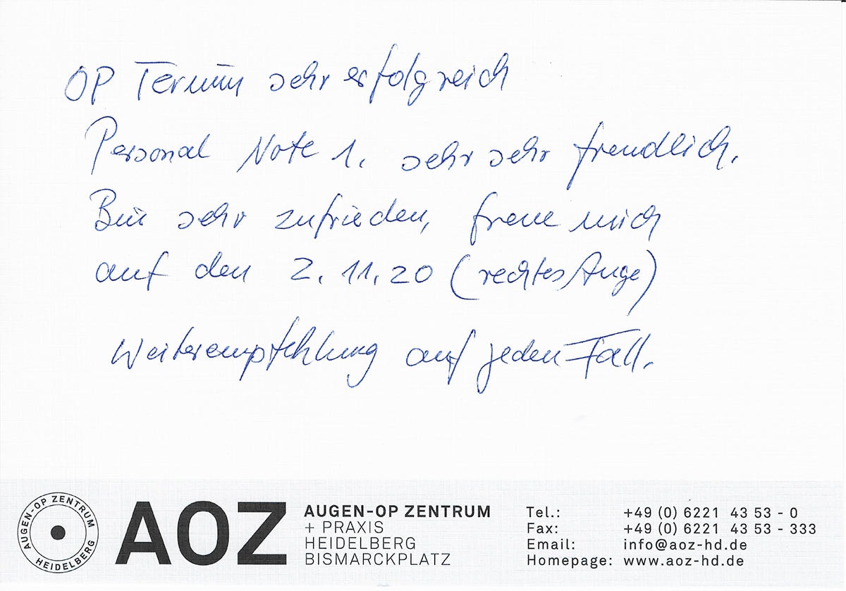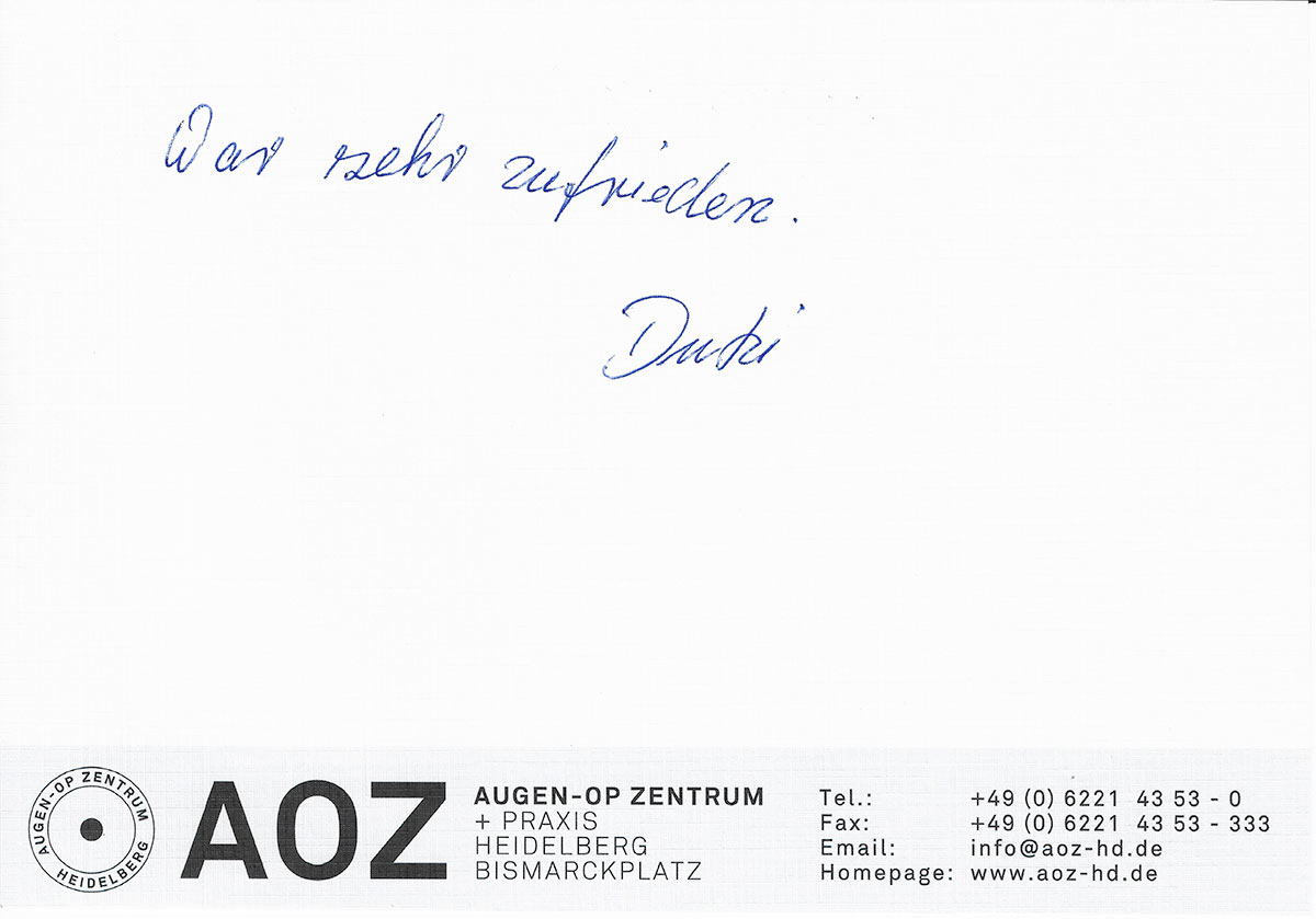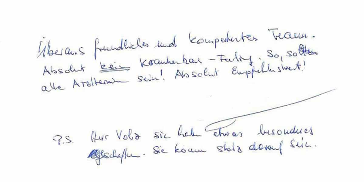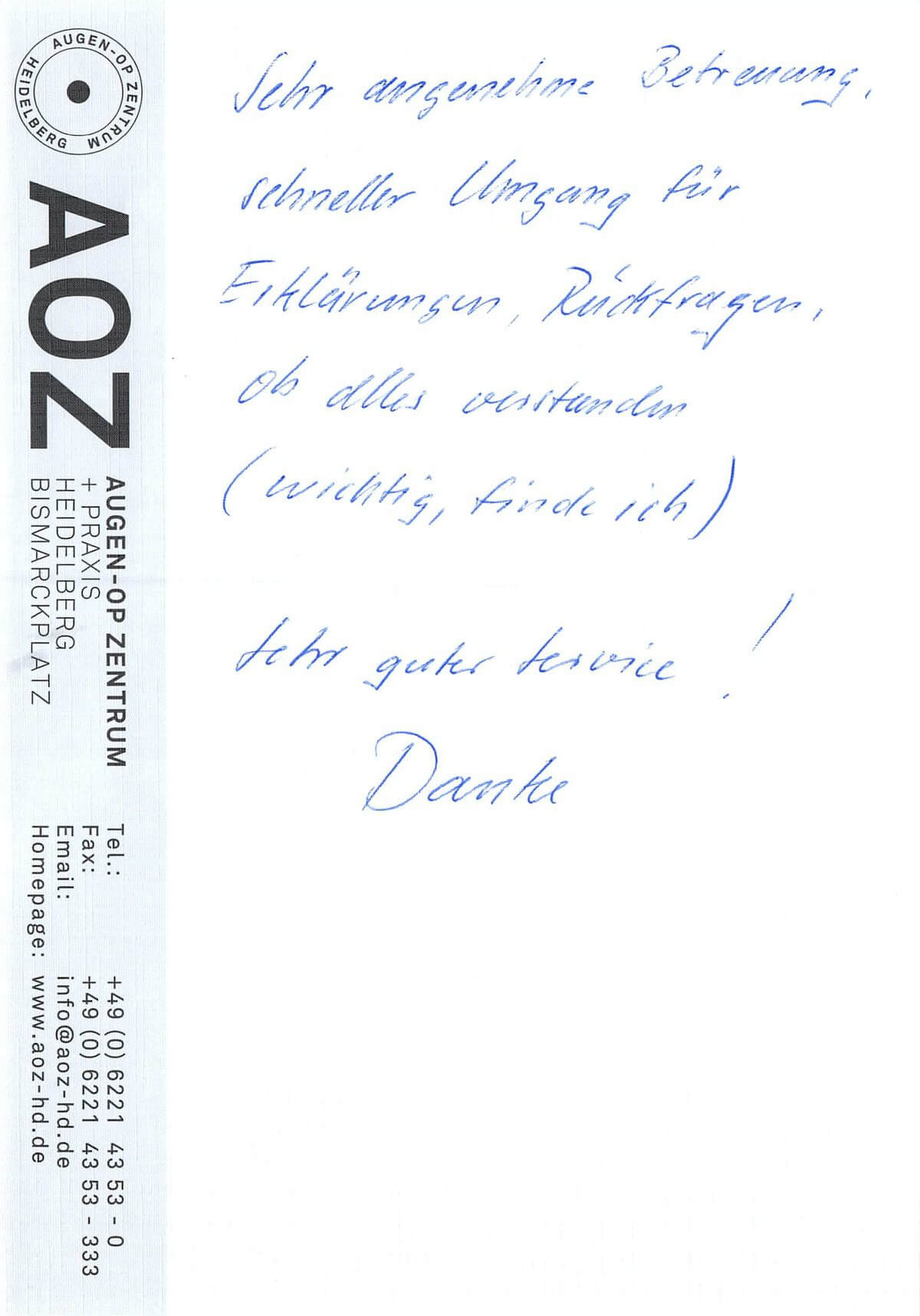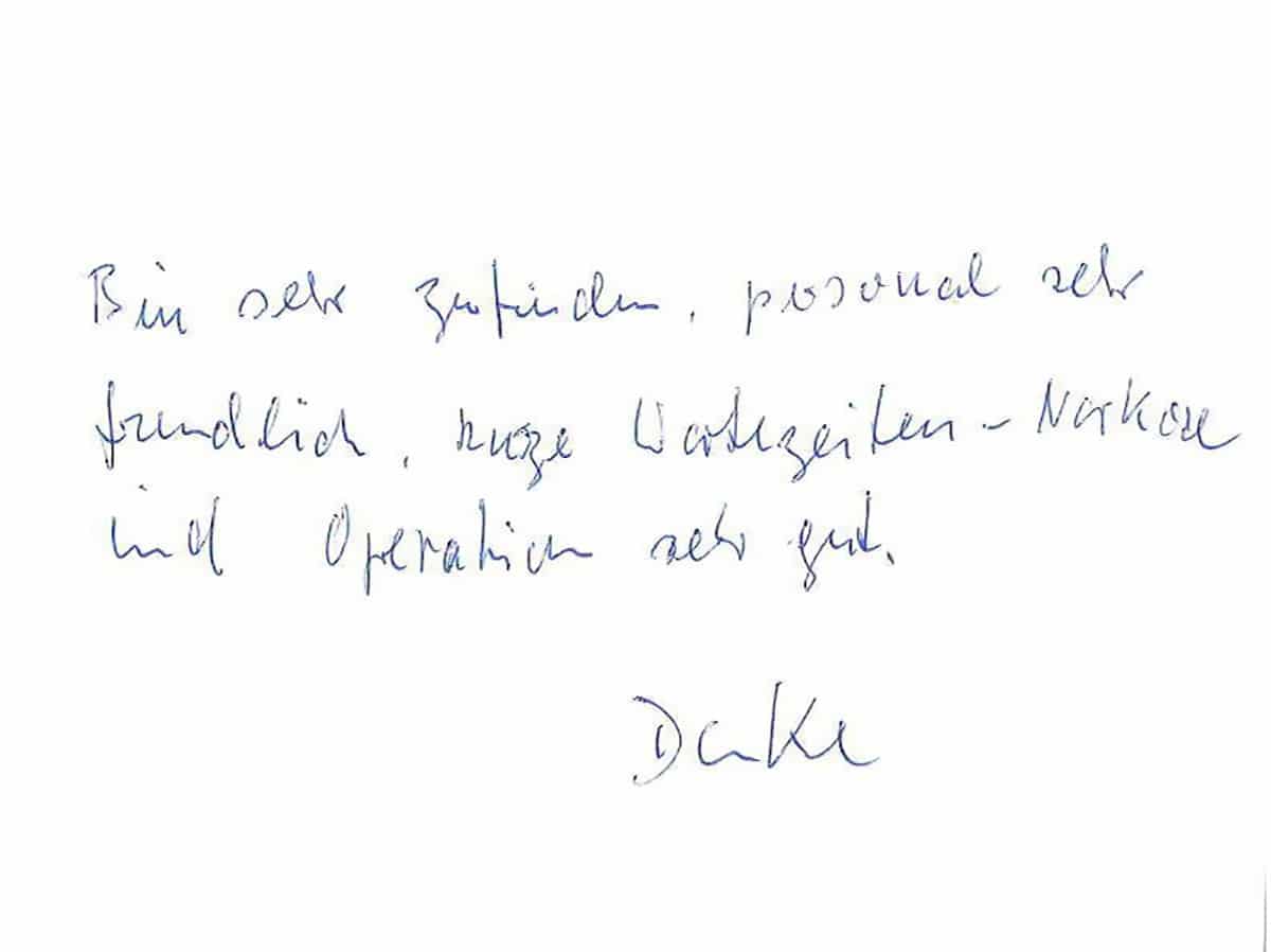Die Erfahrungen unserer Patienten sind uns besonders wichtig. Daher bitten wir sie regelmäßig darum, uns ihre persönliche Meinung und ihre Bewertung aufzuschreiben und diese mit uns und unserem Team zu teilen. Diese Patientenstimmen sind für uns die Chance zur Entwicklung und ein Ansporn uns weiter zu verbessern. Einige unserer Patienten haben wir auch gebeten, uns ihre Erlebnisse im AOZ Heidelberg vor der Kamera zu schildern.