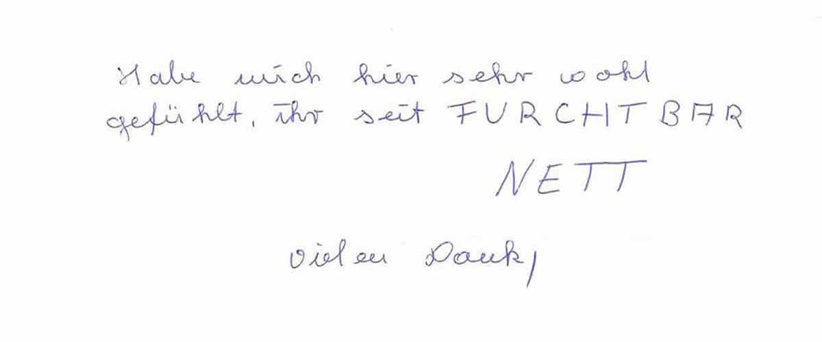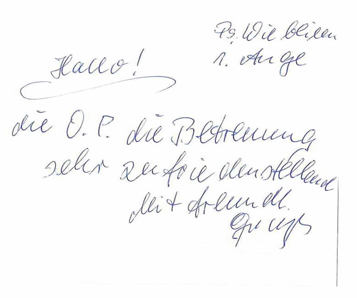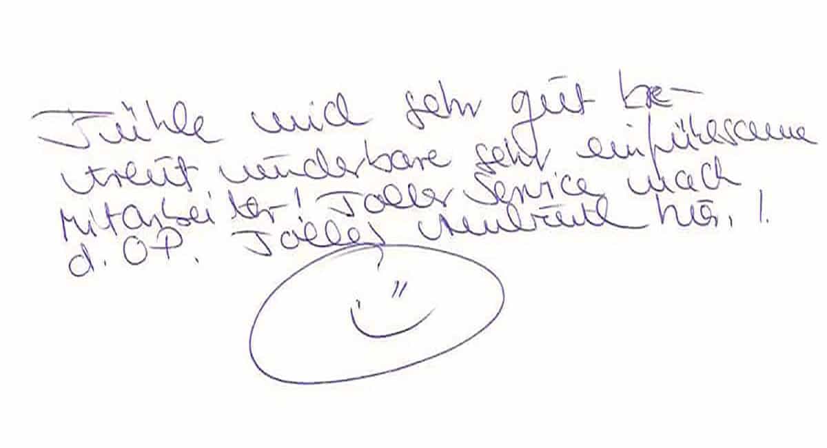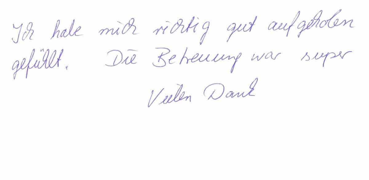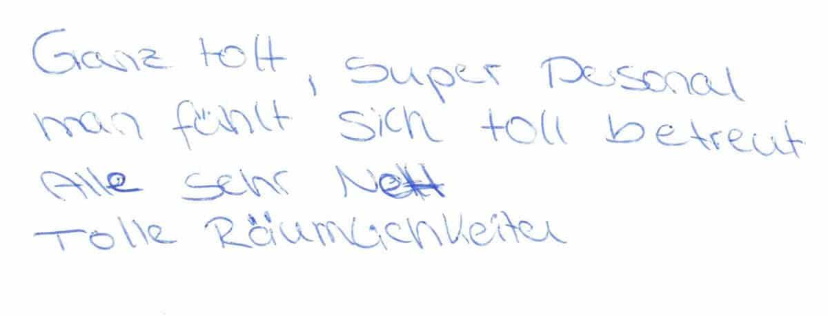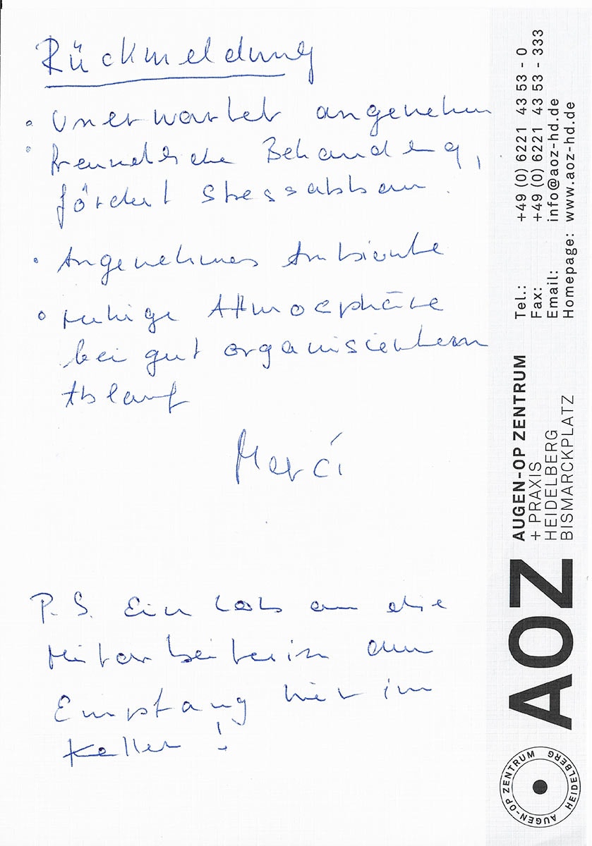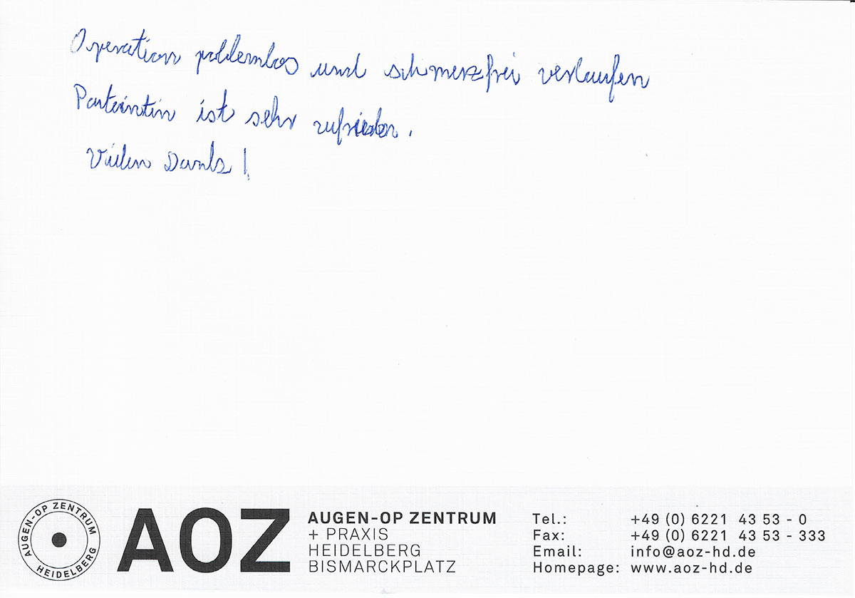 Die Erfahrungen unserer Patienten sind uns besonders wichtig. Daher bitten wir sie regelmäßig darum, uns ihre persönliche Meinung und ihre Bewertung aufzuschreiben und diese mit uns und unserem Team zu teilen. Diese Patientenstimmen sind für uns die Chance zur Entwicklung und ein Ansporn uns weiter zu verbessern. Einige unserer Patienten haben wir auch gebeten, uns ihre Erlebnisse im AOZ Heidelberg vor der Kamera zu schildern.